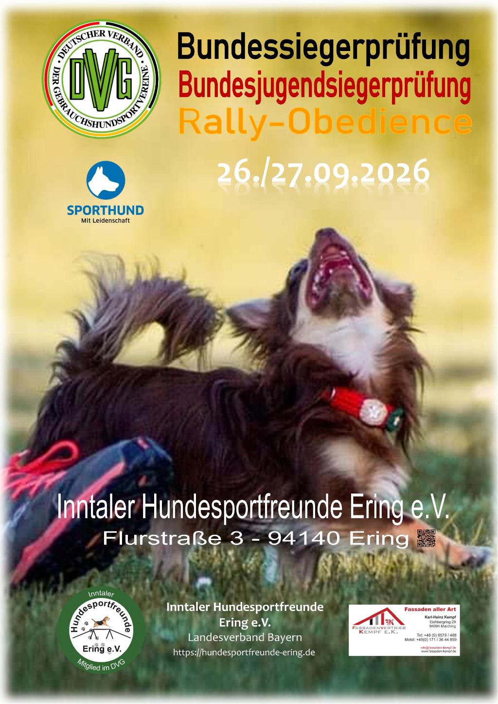 DVG BSP / BJSP Rally-Obedience 2026 Kalender Wann: 26. September 2026 – 27. September 2026 ganztägig Europe/Berlin Zeitzone 2026-09-26T00:00:00+02:00 2026-09-28T00:00:00+02:00 BSP Rally-O Die DVG BSP/BJSP Rally-Obedience wird am 26. und 27. September 2026 (ACHTUNG zur Ordnung abweichender Termin) vom Mitgliedsverein Inntaler Hundesportfreunde Ehrin e.V., LV Bayern ausgerichtet.